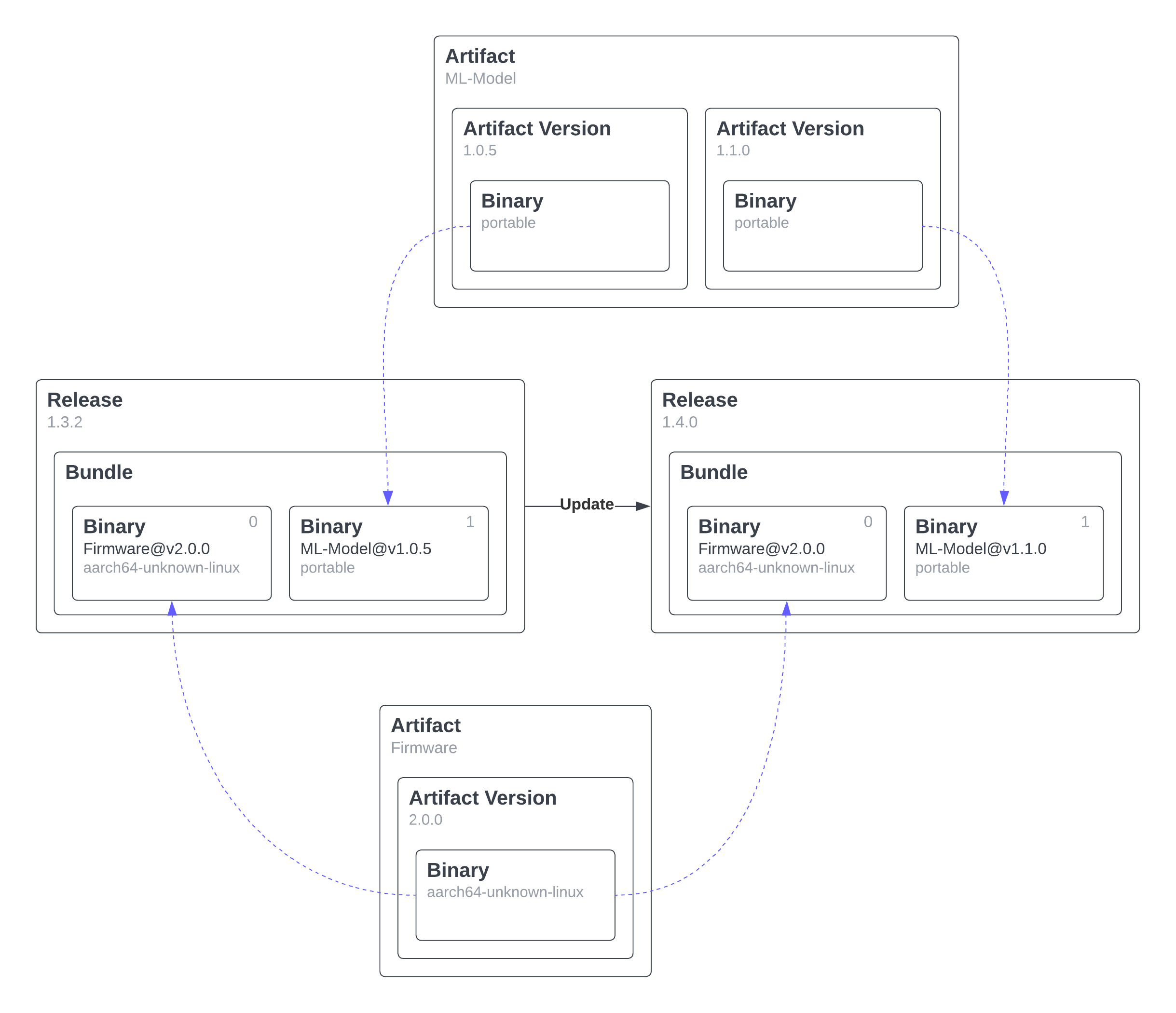 Binaries are the assets you wish to distribute to your devices. There is no restriction on the format of their content. Artifacts are used to define types for your binaries, and artifact versions allow you to track a binary of a certain type across distinct version. Bundles allow you to create immutable, reusable ordered sets of Binaries.